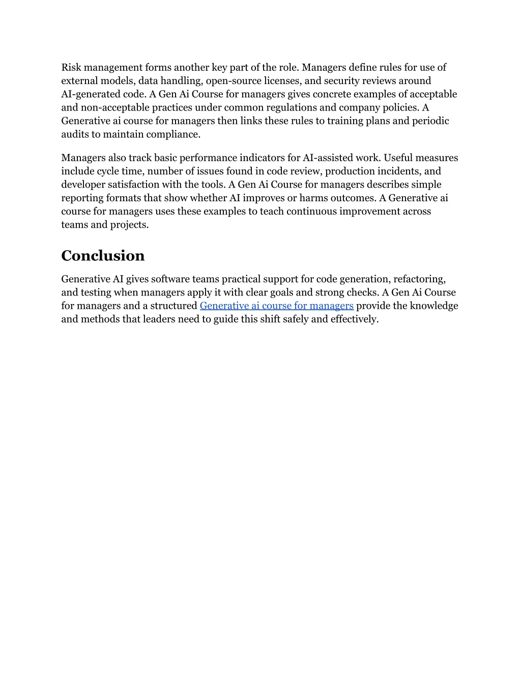 Risk management forms another key part of the role. Managers define rules for use of external models, data handling, open-source licenses, and security reviews around AI-generated code. A Gen Ai Course for managers gives concrete examples of acceptable and non-acceptable practices under common regulations and company policies. A Generative ai course for managers then links these rules to training plans and periodic audits to maintain compliance. Managers also track basic performance indicators for AI-assisted work. Useful measures include cycle time, number of issues found in code review, production incidents, and developer satisfaction with the tools. A Gen Ai Course for managers describes simple reporting formats that show whether AI improves or harms outcomes. A Generative ai course for managers uses these examples to teach continuous improvement across teams and projects. Conclusion Generative AI gives software teams practical support for code generation, refactoring, and testing when managers apply it with clear goals and strong checks. A Gen Ai Course for managers and a structured Generative ai course for managers provide the knowledge and methods that leaders need to guide this shift safely and effectively.