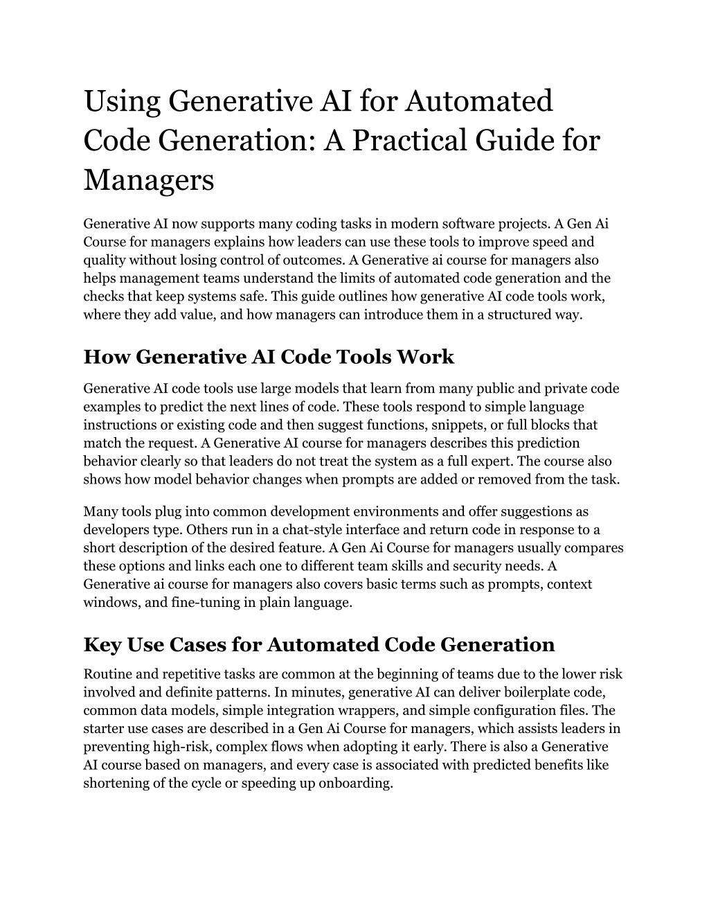 Using Generative AI for Automated Code Generation: A Practical Guide for Managers Generative AI now supports many coding tasks in modern software projects. A Gen Ai Course for managers explains how leaders can use these tools to improve speed and quality without losing control of outcomes. A Generative ai course for managers also helps management teams understand the limits of automated code generation and the checks that keep systems safe. This guide outlines how generative AI code tools work, where they add value, and how managers can introduce them in a structured way. How Generative AI Code Tools Work Generative AI code tools use large models that learn from many public and private code examples to predict the next lines of code. These tools respond to simple language instructions or existing code and then suggest functions, snippets, or full blocks that match the request. A Generative AI course for managers describes this prediction behavior clearly so that leaders do not treat the system as a full expert. The course also shows how model behavior changes when prompts are added or removed from the task. Many tools plug into common development environments and offer suggestions as developers type. Others run in a chat-style interface and return code in response to a short description of the desired feature. A Gen Ai Course for managers usually compares these options and links each one to different team skills and security needs. A Generative ai course for managers also covers basic terms such as prompts, context windows, and fine-tuning in plain language. Key Use Cases for Automated Code Generation Routine and repetitive tasks are common at the beginning of teams due to the lower risk involved and definite patterns. In minutes, generative AI can deliver boilerplate code, common data models, simple integration wrappers, and simple configuration files. The starter use cases are described in a Gen Ai Course for managers, which assists leaders in preventing high-risk, complex flows when adopting it early. There is also a Generative AI course based on managers, and every case is associated with predicted benefits like shortening of the cycle or speeding up onboarding.
