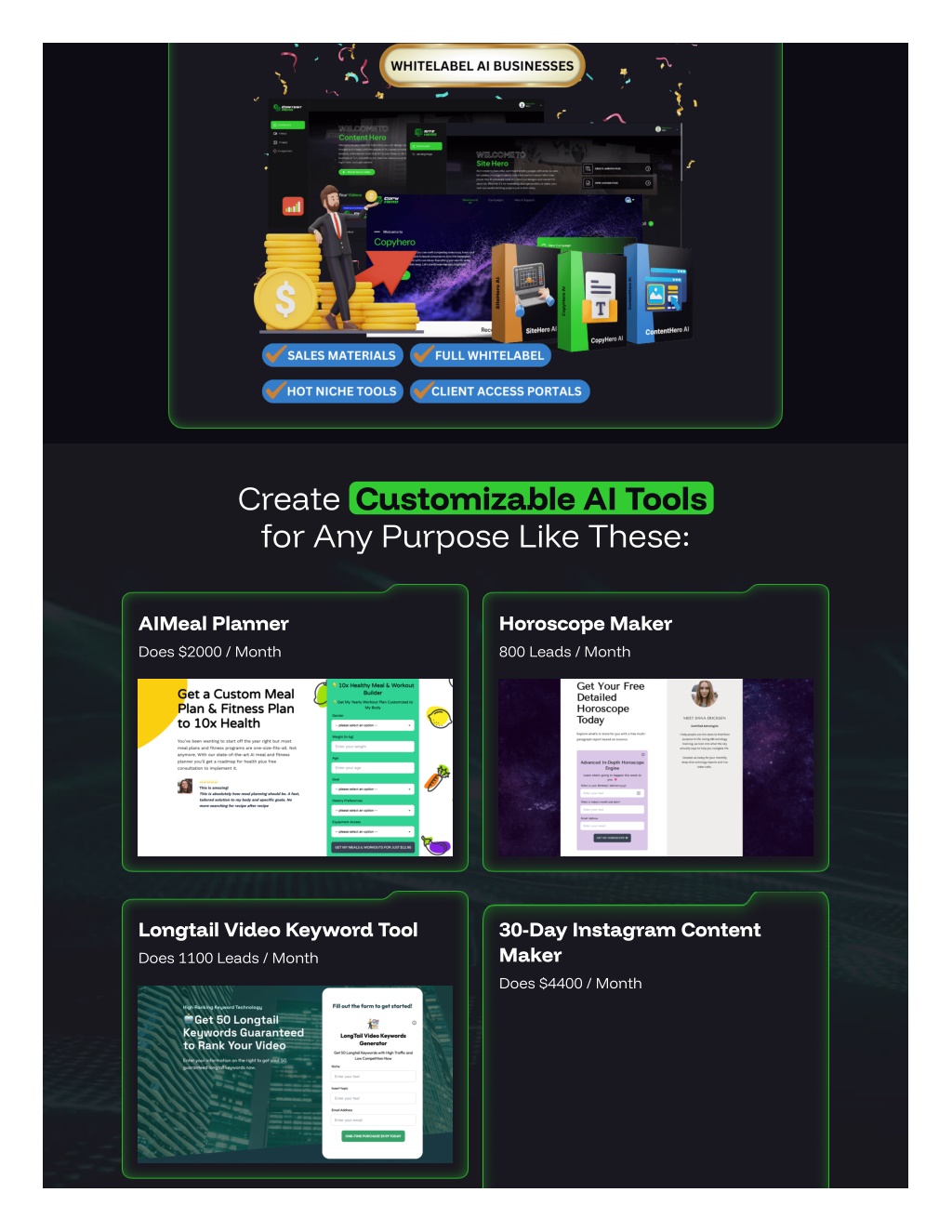 Create Customizable AI Tools for Any Purpose Like These: AIMeal Planner Horoscope Maker Does $2000 / Month 800 Leads / Month Longtail Video Keyword Tool 30-Day Instagram Content Maker Does 1100 Leads / Month Does $4400 / Month