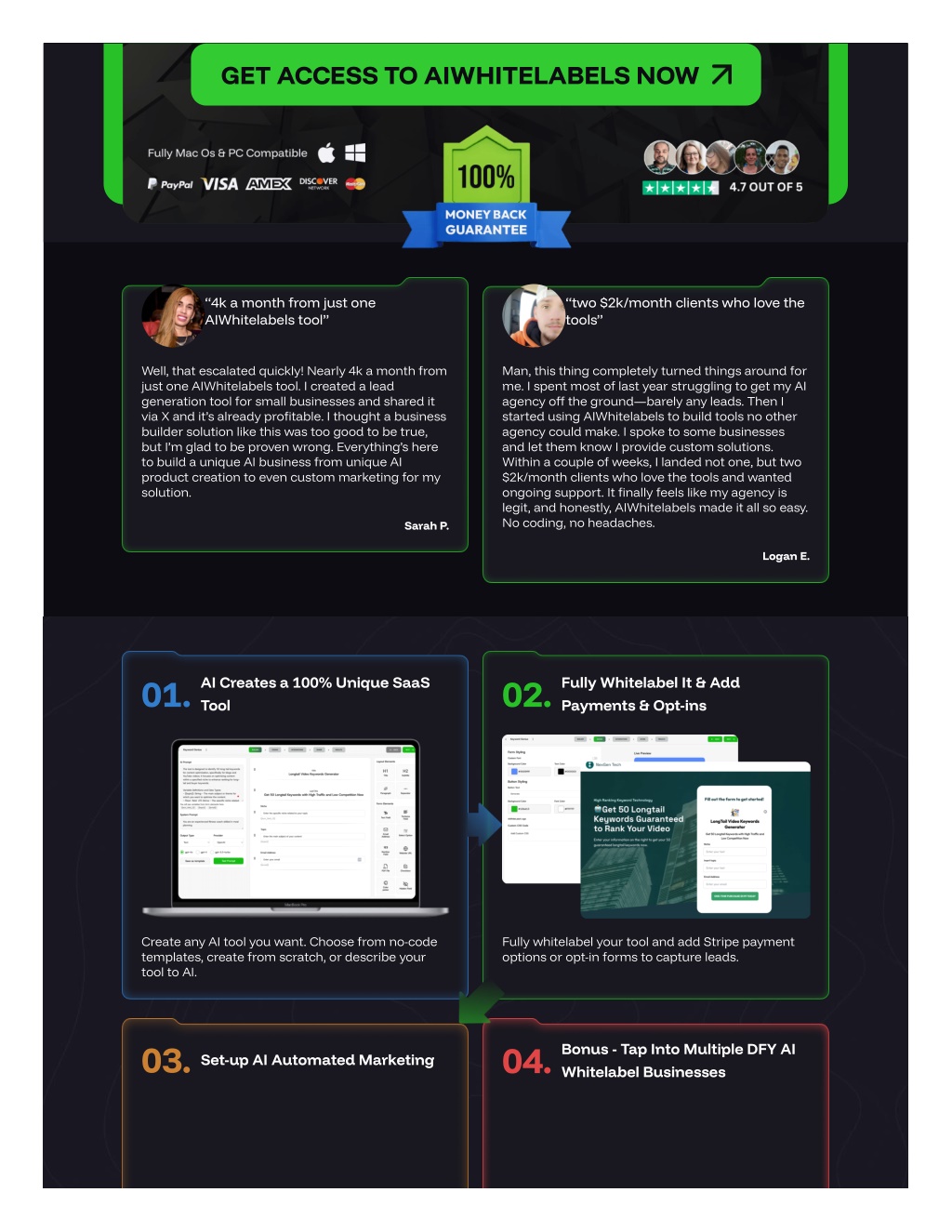 GET ACCESS TO AIWHITELABELS NOW “4k a month from just one AIWhitelabels tool” “two $2k/month clients who love the tools” Well, that escalated quickly! Nearly 4k a month from just one AIWhitelabels tool. I created a lead generation tool for small businesses and shared it via X and it’s already pro?table. I thought a business builder solution like this was too good to be true, but I’m glad to be proven wrong. Everything’s here to build a unique AI business from unique AI product creation to even custom marketing for my solution. Man, this thing completely turned things around for me. I spent most of last year struggling to get my AI agency o? the ground—barely any leads. Then I started using AIWhitelabels to build tools no other agency could make. I spoke to some businesses and let them know I provide custom solutions. Within a couple of weeks, I landed not one, but two $2k/month clients who love the tools and wanted ongoing support. It ?nally feels like my agency is legit, and honestly, AIWhitelabels made it all so easy. No coding, no headaches. Sarah P. Logan E. AI Creates a 100% Unique SaaS Fully Whitelabel It & Add 01. 02. Tool Payments & Opt-ins Create any AI tool you want. Choose from no-code templates, create from scratch, or describe your tool to AI. Fully whitelabel your tool and add Stripe payment options or opt-in forms to capture leads. Bonus - Tap Into Multiple DFY AI 03.Set-up AI Automated Marketing 04. Whitelabel Businesses
