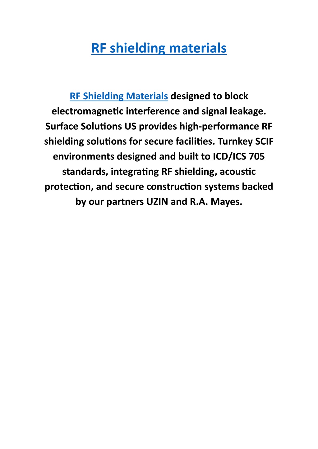 RF shielding materials RF Shielding Materials designed to block electromagnetic interference and signal leakage. Surface Solutions US provides high-performance RF shielding solutions for secure facilities. Turnkey SCIF environments designed and built to ICD/ICS 705 standards, integrating RF shielding, acoustic protection, and secure construction systems backed by our partners UZIN and R.A. Mayes.