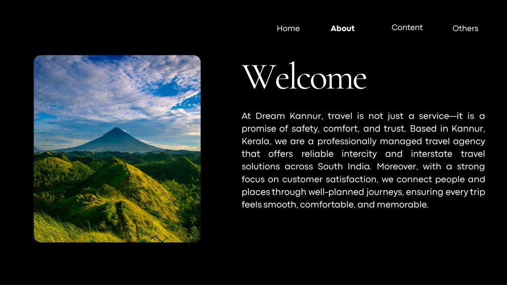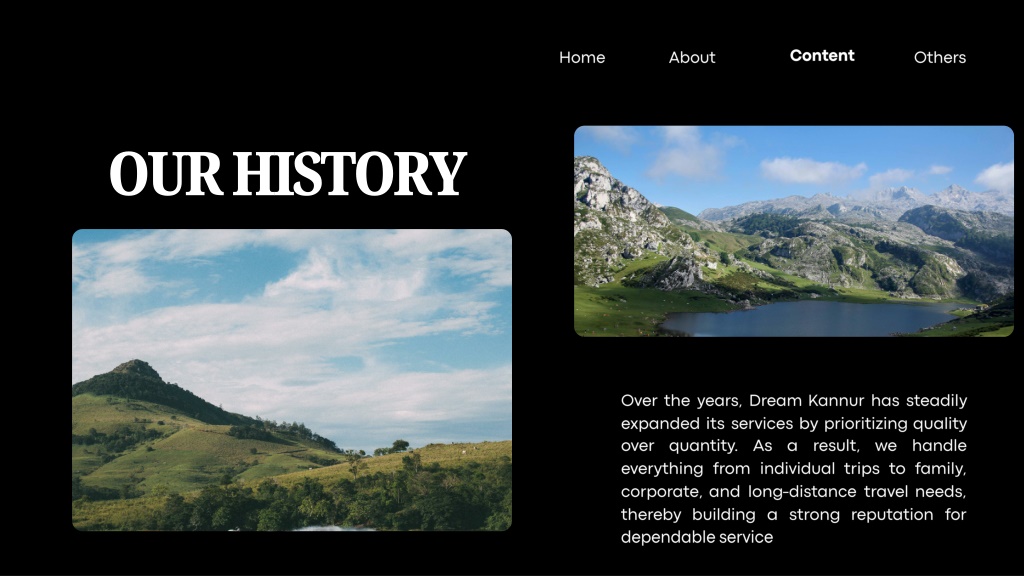 Content • Home • Others • About OUR HISTORY Over the years, Dream Kannur has steadily expanded its services by prioritizing quality over quantity. As a result, we handle everything from individual trips to family, corporate, and long-distance travel needs, thereby building a strong reputation for dependable service