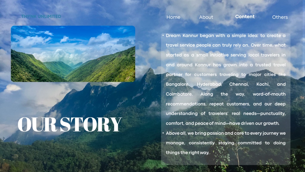 Content THYNK UNLIMITED • Home • Others • About • Dream Kannur began with a simple idea: to create a travel service people can truly rely on. Over time, what started as a small initiative serving local travelers in and around Kannur has grown into a trusted travel partner for customers traveling to major cities like Bangalore, Hyderabad, Chennai, Kochi, and Coimbatore. Along the way, word-of-mouth recommendations, repeat customers, and our deep understanding of travelers’ real needs—punctuality, comfort, and peace of mind—have driven our growth. • Above all, we bring passion and care to every journey we manage, consistently staying committed to doing things the right way. OUR STORY