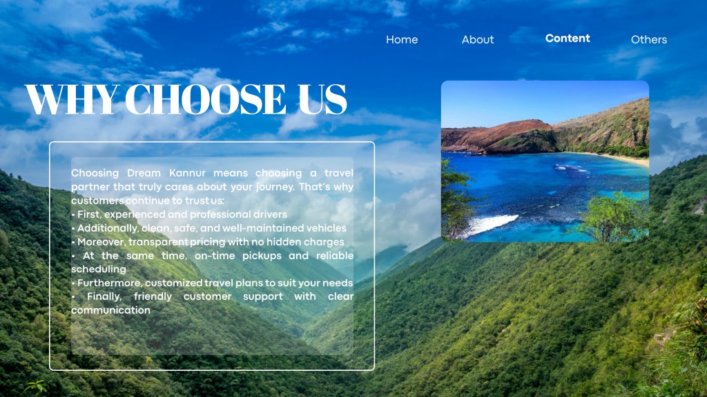 Content • Home • Others • About WHY CHOOSE US Choosing Dream Kannur means choosing a travel partner that truly cares about your journey. That’s why customers continue to trust us: • First, experienced and professional drivers • Additionally, clean, safe, and well-maintained vehicles • Moreover, transparent pricing with no hidden charges • At the same time, on-time pickups and reliable scheduling • Furthermore, customized travel plans to suit your needs • Finally, friendly customer support with clear communication