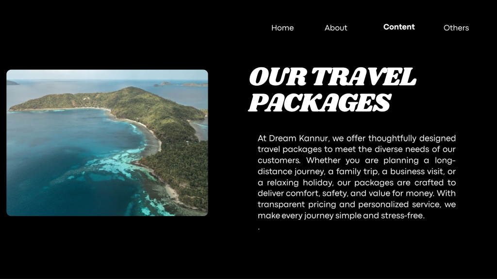 Content • Home • Others • About OUR TRAVEL PACKAGES At Dream Kannur, we offer thoughtfully designed travel packages to meet the diverse needs of our customers. Whether you are planning a long-distance journey, a family trip, a business visit, or a relaxing holiday, our packages are crafted to deliver comfort, safety, and value for money. With transparent pricing and personalized service, we make every journey simple and stress-free. .