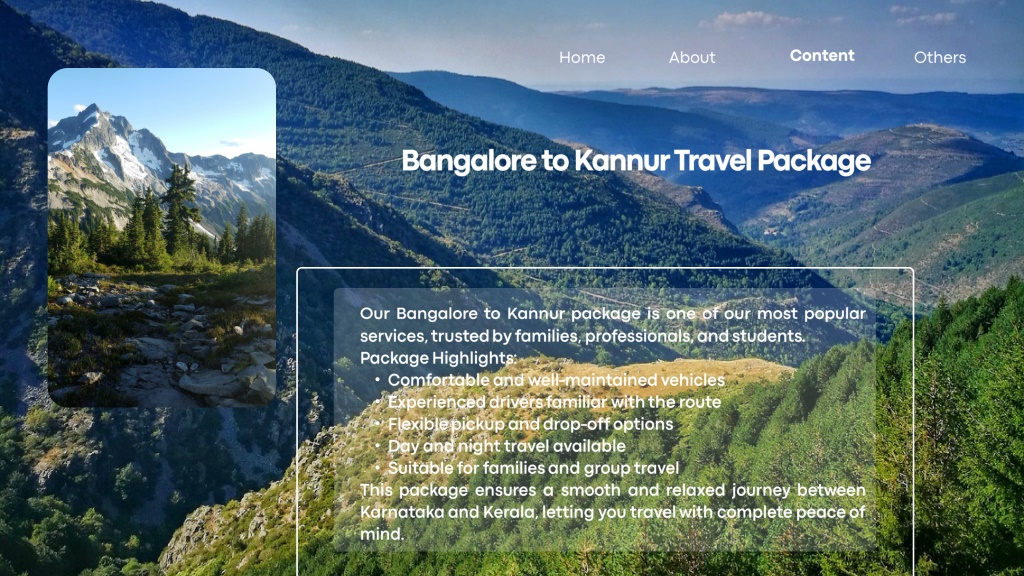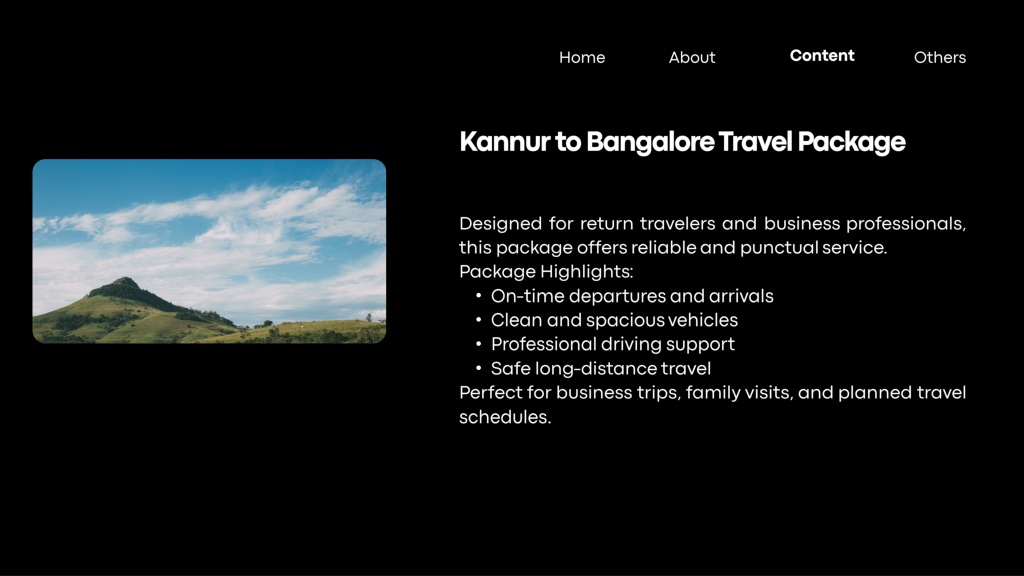 Content • Home • Others • About Bangalore to Kannur Travel Package • Our Bangalore to Kannur package is one of our most popular services, trusted by families, professionals, and students. • Package Highlights: • Comfortable and well-maintained vehicles • Experienced drivers familiar with the route • Flexible pickup and drop-off options • Day and night travel available • Suitable for families and group travel • This package ensures a smooth and relaxed journey between Karnataka and Kerala, letting you travel with complete peace of mind.