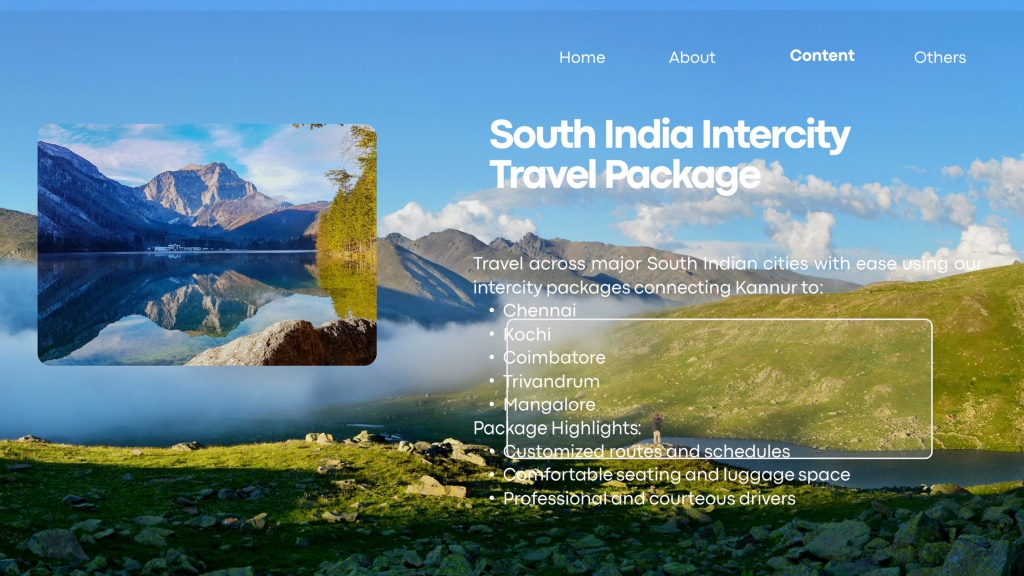 Content • Home • Others • About South India Intercity Travel Package • Travel across major South Indian cities with ease using our intercity packages connecting Kannur to: • Chennai • Kochi • Coimbatore • Trivandrum • Mangalore • Package Highlights: • Customized routes and schedules • Comfortable seating and luggage space • Professional and courteous drivers
