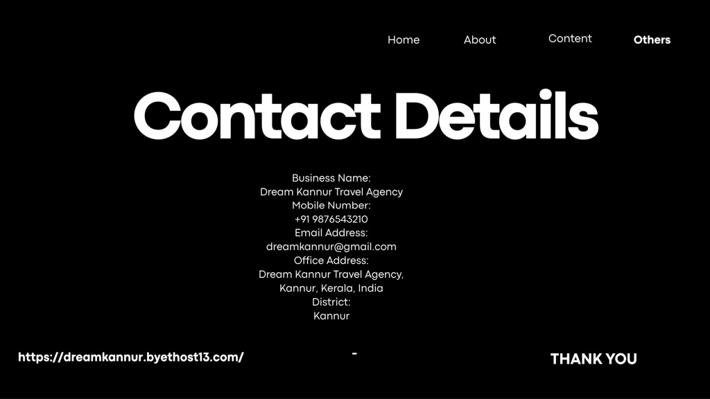 Content • Home • Others • About Contact Details Business Name: Dream Kannur Travel Agency Mobile Number: +91 9876543210 Email Address: dreamkannur@gmail.com Office Address: Dream Kannur Travel Agency, Kannur, Kerala, India District: Kannur - THANK YOU https://dreamkannur.byethost13.com/