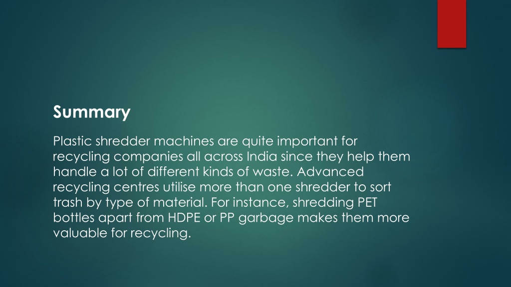 Summary Plastic shredder machines are quite important for recycling companies all across India since they help them handle a lot of different kinds of waste. Advanced recycling centres utilise more than one shredder to sort trash by type of material. For instance, shredding PET bottles apart from HDPE or PP garbage makes them more valuable for recycling.