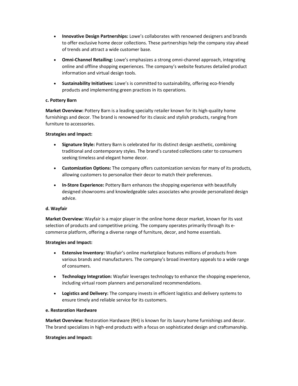 Innovative Design Partnerships: Lowe’s collaborates with renowned designers and brands to offer exclusive home decor collections. These partnerships help the company stay ahead of trends and attract a wide customer base. Omni-Channel Retailing: Lowe’s emphasizes a strong omni-channel approach, integrating online and offline shopping experiences. The company’s website features detailed product information and virtual design tools. Sustainability Initiatives: Lowe’s is committed to sustainability, offering eco-friendly products and implementing green practices in its operations. c. Pottery Barn Market Overview: Pottery Barn is a leading specialty retailer known for its high-quality home furnishings and decor. The brand is renowned for its classic and stylish products, ranging from furniture to accessories. Strategies and Impact: Signature Style: Pottery Barn is celebrated for its distinct design aesthetic, combining traditional and contemporary styles. The brand’s curated collections cater to consumers seeking timeless and elegant home decor. Customization Options: The company offers customization services for many of its products, allowing customers to personalize their decor to match their preferences. In-Store Experience: Pottery Barn enhances the shopping experience with beautifully designed showrooms and knowledgeable sales associates who provide personalized design advice. d. Wayfair Market Overview: Wayfair is a major player in the online home decor market, known for its vast selection of products and competitive pricing. The company operates primarily through its e- commerce platform, offering a diverse range of furniture, decor, and home essentials. Strategies and Impact: Extensive Inventory: Wayfair’s online marketplace features millions of products from various brands and manufacturers. The company’s broad inventory appeals to a wide range of consumers. Technology Integration: Wayfair leverages technology to enhance the shopping experience, including virtual room planners and personalized recommendations. Logistics and Delivery: The company invests in efficient logistics and delivery systems to ensure timely and reliable service for its customers. e. Restoration Hardware Market Overview: Restoration Hardware (RH) is known for its luxury home furnishings and decor. The brand specializes in high-end products with a focus on sophisticated design and craftsmanship. Strategies and Impact:
