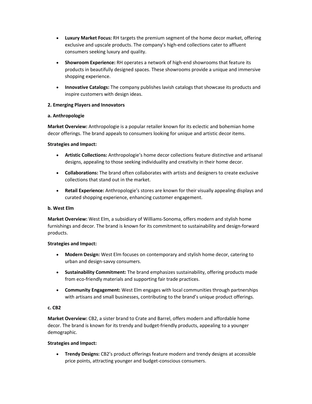 Luxury Market Focus: RH targets the premium segment of the home decor market, offering exclusive and upscale products. The company’s high-end collections cater to affluent consumers seeking luxury and quality. Showroom Experience: RH operates a network of high-end showrooms that feature its products in beautifully designed spaces. These showrooms provide a unique and immersive shopping experience. Innovative Catalogs: The company publishes lavish catalogs that showcase its products and inspire customers with design ideas. 2. Emerging Players and Innovators a. Anthropologie Market Overview: Anthropologie is a popular retailer known for its eclectic and bohemian home decor offerings. The brand appeals to consumers looking for unique and artistic decor items. Strategies and Impact: Artistic Collections: Anthropologie’s home decor collections feature distinctive and artisanal designs, appealing to those seeking individuality and creativity in their home decor. Collaborations: The brand often collaborates with artists and designers to create exclusive collections that stand out in the market. Retail Experience: Anthropologie’s stores are known for their visually appealing displays and curated shopping experience, enhancing customer engagement. b. West Elm Market Overview: West Elm, a subsidiary of Williams-Sonoma, offers modern and stylish home furnishings and decor. The brand is known for its commitment to sustainability and design-forward products. Strategies and Impact: Modern Design: West Elm focuses on contemporary and stylish home decor, catering to urban and design-savvy consumers. Sustainability Commitment: The brand emphasizes sustainability, offering products made from eco-friendly materials and supporting fair trade practices. Community Engagement: West Elm engages with local communities through partnerships with artisans and small businesses, contributing to the brand’s unique product offerings. c. CB2 Market Overview: CB2, a sister brand to Crate and Barrel, offers modern and affordable home decor. The brand is known for its trendy and budget-friendly products, appealing to a younger demographic. Strategies and Impact: Trendy Designs: CB2’s product offerings feature modern and trendy designs at accessible price points, attracting younger and budget-conscious consumers.