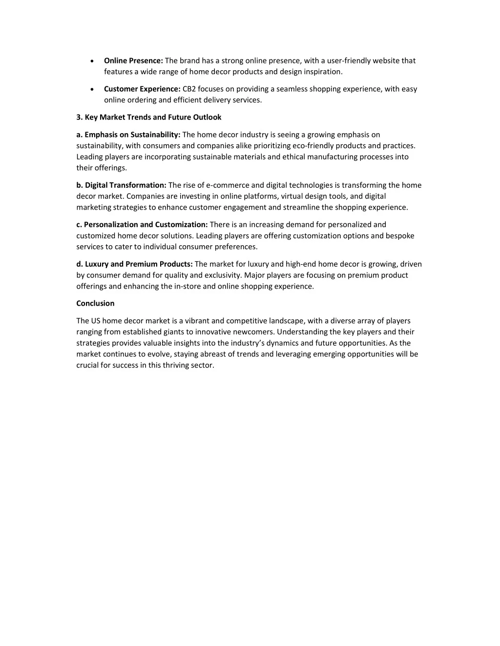 Online Presence: The brand has a strong online presence, with a user-friendly website that features a wide range of home decor products and design inspiration. Customer Experience: CB2 focuses on providing a seamless shopping experience, with easy online ordering and efficient delivery services. 3. Key Market Trends and Future Outlook a. Emphasis on Sustainability: The home decor industry is seeing a growing emphasis on sustainability, with consumers and companies alike prioritizing eco-friendly products and practices. Leading players are incorporating sustainable materials and ethical manufacturing processes into their offerings. b. Digital Transformation: The rise of e-commerce and digital technologies is transforming the home decor market. Companies are investing in online platforms, virtual design tools, and digital marketing strategies to enhance customer engagement and streamline the shopping experience. c. Personalization and Customization: There is an increasing demand for personalized and customized home decor solutions. Leading players are offering customization options and bespoke services to cater to individual consumer preferences. d. Luxury and Premium Products: The market for luxury and high-end home decor is growing, driven by consumer demand for quality and exclusivity. Major players are focusing on premium product offerings and enhancing the in-store and online shopping experience. Conclusion The US home decor market is a vibrant and competitive landscape, with a diverse array of players ranging from established giants to innovative newcomers. Understanding the key players and their strategies provides valuable insights into the industry’s dynamics and future opportunities. As the market continues to evolve, staying abreast of trends and leveraging emerging opportunities will be crucial for success in this thriving sector.