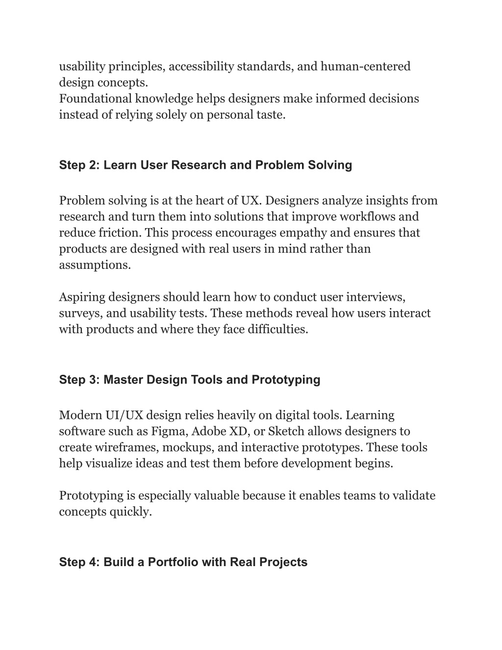 usability principles, accessibility standards, and human-centered design concepts. Foundational knowledge helps designers make informed decisions instead of relying solely on personal taste. Step 2: Learn User Research and Problem Solving Problem solving is at the heart of UX. Designers analyze insights from research and turn them into solutions that improve workflows and reduce friction. This process encourages empathy and ensures that products are designed with real users in mind rather than assumptions. Aspiring designers should learn how to conduct user interviews, surveys, and usability tests. These methods reveal how users interact with products and where they face difficulties. Step 3: Master Design Tools and Prototyping Modern UI/UX design relies heavily on digital tools. Learning software such as Figma, Adobe XD, or Sketch allows designers to create wireframes, mockups, and interactive prototypes. These tools help visualize ideas and test them before development begins. Prototyping is especially valuable because it enables teams to validate concepts quickly. Step 4: Build a Portfolio with Real Projects
