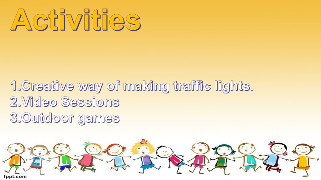 Activities 1.Creative way of making traffic lights. 2.Video Sessions 3.Outdoor games