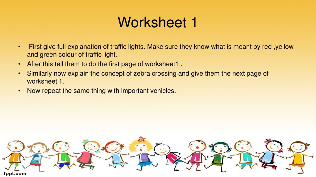 Worksheet 1 • First give full explanation of traffic lights. Make sure they know what is meant by red ,yellow and green colour of traffic light. • After this tell them to do the first page of worksheet1 . • Similarly now explain the concept of zebra crossing and give them the next page of worksheet 1. • Now repeat the same thing with important vehicles.