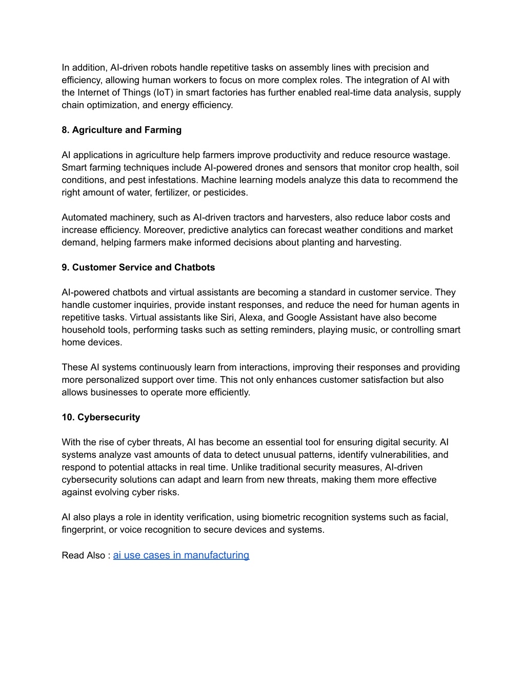 In addition, AI-driven robots handle repetitive tasks on assembly lines with precision and efficiency, allowing human workers to focus on more complex roles. The integration of AI with the Internet of Things (IoT) in smart factories has further enabled real-time data analysis, supply chain optimization, and energy efficiency. 8. Agriculture and Farming AI applications in agriculture help farmers improve productivity and reduce resource wastage. Smart farming techniques include AI-powered drones and sensors that monitor crop health, soil conditions, and pest infestations. Machine learning models analyze this data to recommend the right amount of water, fertilizer, or pesticides. Automated machinery, such as AI-driven tractors and harvesters, also reduce labor costs and increase efficiency. Moreover, predictive analytics can forecast weather conditions and market demand, helping farmers make informed decisions about planting and harvesting. 9. Customer Service and Chatbots AI-powered chatbots and virtual assistants are becoming a standard in customer service. They handle customer inquiries, provide instant responses, and reduce the need for human agents in repetitive tasks. Virtual assistants like Siri, Alexa, and Google Assistant have also become household tools, performing tasks such as setting reminders, playing music, or controlling smart home devices. These AI systems continuously learn from interactions, improving their responses and providing more personalized support over time. This not only enhances customer satisfaction but also allows businesses to operate more efficiently. 10. Cybersecurity With the rise of cyber threats, AI has become an essential tool for ensuring digital security. AI systems analyze vast amounts of data to detect unusual patterns, identify vulnerabilities, and respond to potential attacks in real time. Unlike traditional security measures, AI-driven cybersecurity solutions can adapt and learn from new threats, making them more effective against evolving cyber risks. AI also plays a role in identity verification, using biometric recognition systems such as facial, fingerprint, or voice recognition to secure devices and systems. Read Also : ai use cases in manufacturing