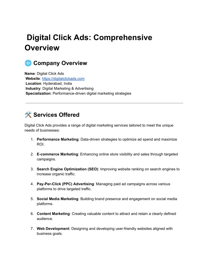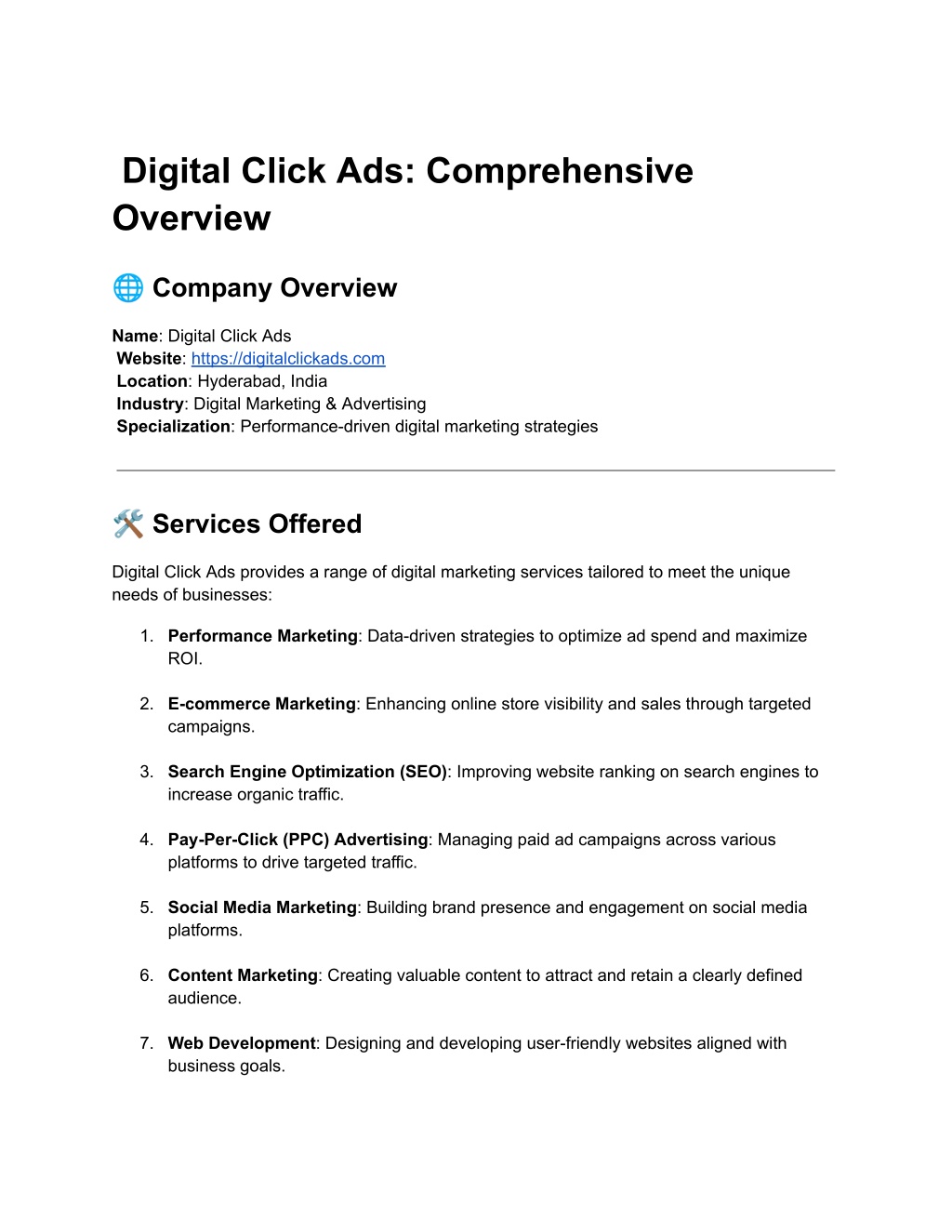 Digital Click Ads: Comprehensive Overview ? Company Overview Name: Digital Click Ads Website: https://digitalclickads.com Location: Hyderabad, India Industry: Digital Marketing & Advertising Specialization: Performance-driven digital marketing strategies ? Services Offered Digital Click Ads provides a range of digital marketing services tailored to meet the unique needs of businesses: 1. Performance Marketing: Data-driven strategies to optimize ad spend and maximize ROI. 2. E-commerce Marketing: Enhancing online store visibility and sales through targeted campaigns. 3. Search Engine Optimization (SEO): Improving website ranking on search engines to increase organic traffic. 4. Pay-Per-Click (PPC) Advertising: Managing paid ad campaigns across various platforms to drive targeted traffic. 5. Social Media Marketing: Building brand presence and engagement on social media platforms. 6. Content Marketing: Creating valuable content to attract and retain a clearly defined audience. 7. Web Development: Designing and developing user-friendly websites aligned with business goals.
