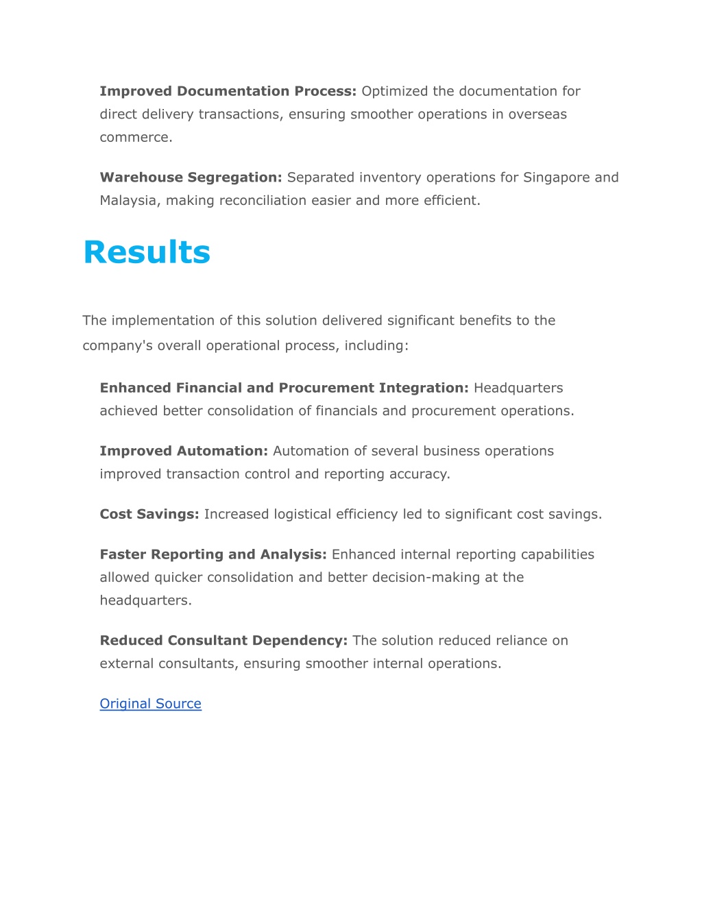 Improved Documentation Process: Optimized the documentation for direct delivery transactions, ensuring smoother operations in overseas commerce. Warehouse Segregation: Separated inventory operations for Singapore and Malaysia, making reconciliation easier and more efficient. Results The implementation of this solution delivered significant benefits to the company's overall operational process, including: Enhanced Financial and Procurement Integration: Headquarters achieved better consolidation of financials and procurement operations. Improved Automation: Automation of several business operations improved transaction control and reporting accuracy. Cost Savings: Increased logistical efficiency led to significant cost savings. Faster Reporting and Analysis: Enhanced internal reporting capabilities allowed quicker consolidation and better decision-making at the headquarters. Reduced Consultant Dependency: The solution reduced reliance on external consultants, ensuring smoother internal operations. Original Source