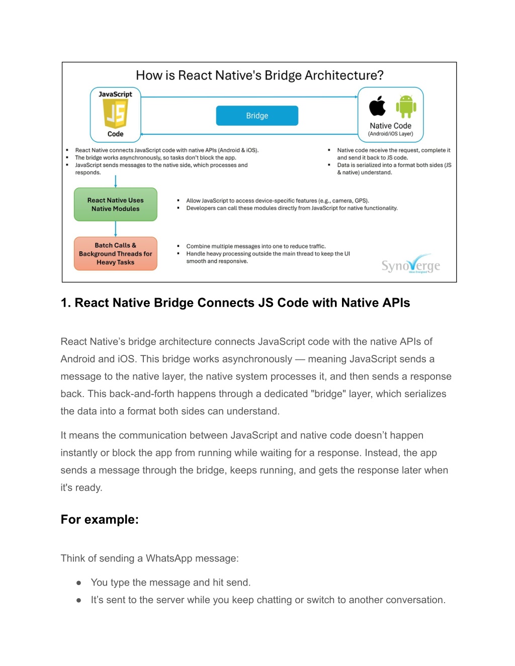 1. React Native Bridge Connects JS Code with Native APIs React Native’s bridge architecture connects JavaScript code with the native APIs of Android and iOS. This bridge works asynchronously — meaning JavaScript sends a message to the native layer, the native system processes it, and then sends a response back. This back-and-forth happens through a dedicated "bridge" layer, which serializes the data into a format both sides can understand. It means the communication between JavaScript and native code doesn’t happen instantly or block the app from running while waiting for a response. Instead, the app sends a message through the bridge, keeps running, and gets the response later when it's ready. For example: Think of sending a WhatsApp message: ● You type the message and hit send. ● It’s sent to the server while you keep chatting or switch to another conversation.