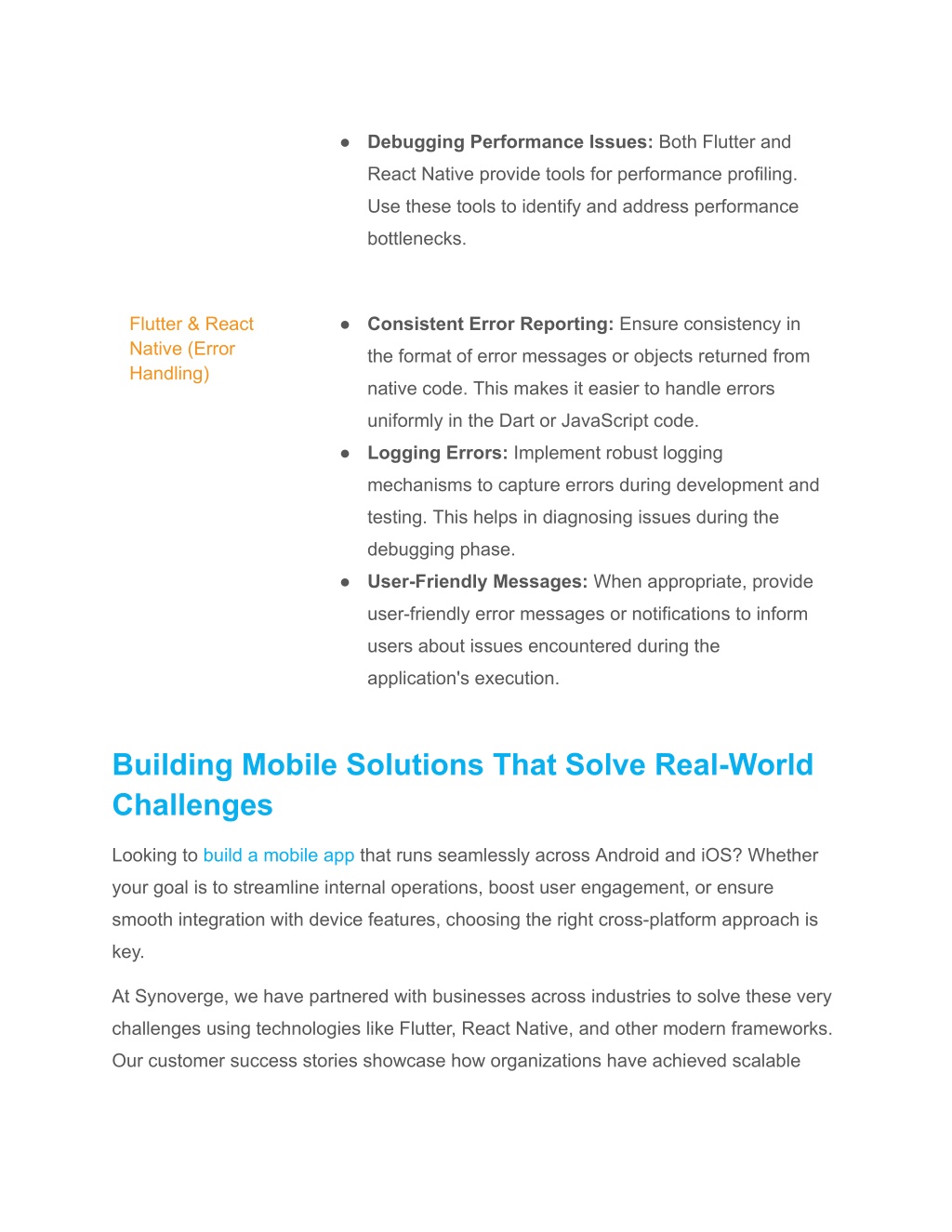 ● Debugging Performance Issues: Both Flutter and React Native provide tools for performance profiling. Use these tools to identify and address performance bottlenecks. Flutter & React Native (Error Handling) ● Consistent Error Reporting: Ensure consistency in the format of error messages or objects returned from native code. This makes it easier to handle errors uniformly in the Dart or JavaScript code. ● Logging Errors: Implement robust logging mechanisms to capture errors during development and testing. This helps in diagnosing issues during the debugging phase. ● User-Friendly Messages: When appropriate, provide user-friendly error messages or notifications to inform users about issues encountered during the application's execution. Building Mobile Solutions That Solve Real-World Challenges Looking to build a mobile app that runs seamlessly across Android and iOS? Whether your goal is to streamline internal operations, boost user engagement, or ensure smooth integration with device features, choosing the right cross-platform approach is key. At Synoverge, we have partnered with businesses across industries to solve these very challenges using technologies like Flutter, React Native, and other modern frameworks. Our customer success stories showcase how organizations have achieved scalable