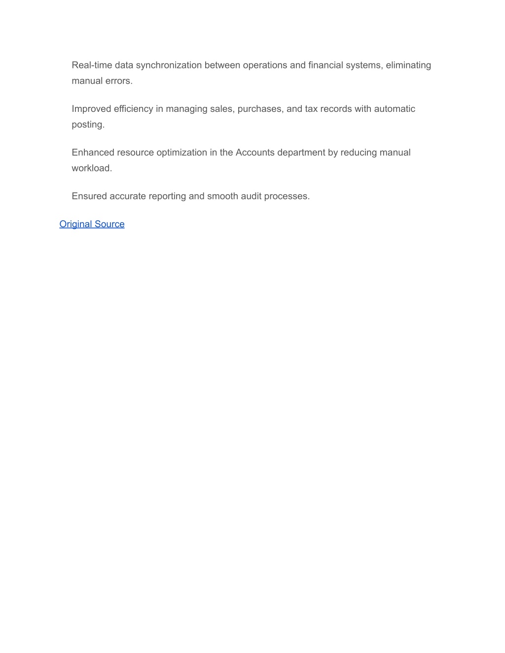 Real-time data synchronization between operations and financial systems, eliminating manual errors. Improved efficiency in managing sales, purchases, and tax records with automatic posting. Enhanced resource optimization in the Accounts department by reducing manual workload. Ensured accurate reporting and smooth audit processes. Original Source