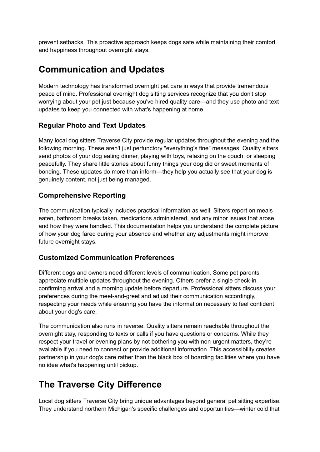 prevent setbacks. This proactive approach keeps dogs safe while maintaining their comfort and happiness throughout overnight stays. Communication and Updates Modern technology has transformed overnight pet care in ways that provide tremendous peace of mind. Professional overnight dog sitting services recognize that you don't stop worrying about your pet just because you've hired quality care—and they use photo and text updates to keep you connected with what's happening at home. Regular Photo and Text Updates Many local dog sitters Traverse City provide regular updates throughout the evening and the following morning. These aren't just perfunctory "everything's fine" messages. Quality sitters send photos of your dog eating dinner, playing with toys, relaxing on the couch, or sleeping peacefully. They share little stories about funny things your dog did or sweet moments of bonding. These updates do more than inform—they help you actually see that your dog is genuinely content, not just being managed. Comprehensive Reporting The communication typically includes practical information as well. Sitters report on meals eaten, bathroom breaks taken, medications administered, and any minor issues that arose and how they were handled. This documentation helps you understand the complete picture of how your dog fared during your absence and whether any adjustments might improve future overnight stays. Customized Communication Preferences Different dogs and owners need different levels of communication. Some pet parents appreciate multiple updates throughout the evening. Others prefer a single check-in confirming arrival and a morning update before departure. Professional sitters discuss your preferences during the meet-and-greet and adjust their communication accordingly, respecting your needs while ensuring you have the information necessary to feel confident about your dog's care. The communication also runs in reverse. Quality sitters remain reachable throughout the overnight stay, responding to texts or calls if you have questions or concerns. While they respect your travel or evening plans by not bothering you with non-urgent matters, they're available if you need to connect or provide additional information. This accessibility creates partnership in your dog's care rather than the black box of boarding facilities where you have no idea what's happening until pickup. The Traverse City Difference Local dog sitters Traverse City bring unique advantages beyond general pet sitting expertise. They understand northern Michigan's specific challenges and opportunities—winter cold that