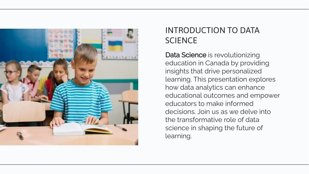INTRODUCTION TO DATA SCIENCE Data Science is revolutionizing education in Canada by providing insights that drive personalized learning. This presentation explores how data analytics can enhance educational outcomes and empower educators to make informed decisions. Join us as we delve into the transformative role of data science in shaping the future of learning.