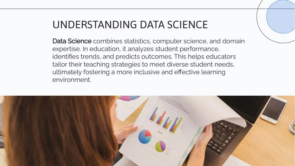 UNDERSTANDING DATA SCIENCE Data Science combines statistics, computer science, and domain expertise. In education, it analyzes student performance, identifies trends, and predicts outcomes. This helps educators tailor their teaching strategies to meet diverse student needs, ultimately fostering a more inclusive and effective learning environment.