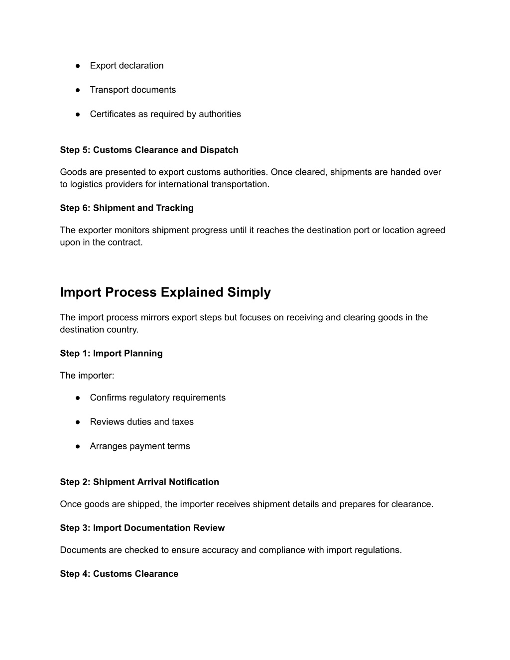 4. ● Export declaration ● Transport documents ● Certificates as required by authorities Step 5: Customs Clearance and Dispatch Goods are presented to export customs authorities. Once cleared, shipments are handed over to logistics providers for international transportation. Step 6: Shipment and Tracking The exporter monitors shipment progress until it reaches the destination port or location agreed upon in the contract. Import Process Explained Simply The import process mirrors export steps but focuses on receiving and clearing goods in the destination country. Step 1: Import Planning The importer: ● Confirms regulatory requirements ● Reviews duties and taxes ● Arranges payment terms Step 2: Shipment Arrival Notification Once goods are shipped, the importer receives shipment details and prepares for clearance. Step 3: Import Documentation Review Documents are checked to ensure accuracy and compliance with import regulations. Step 4: Customs Clearance