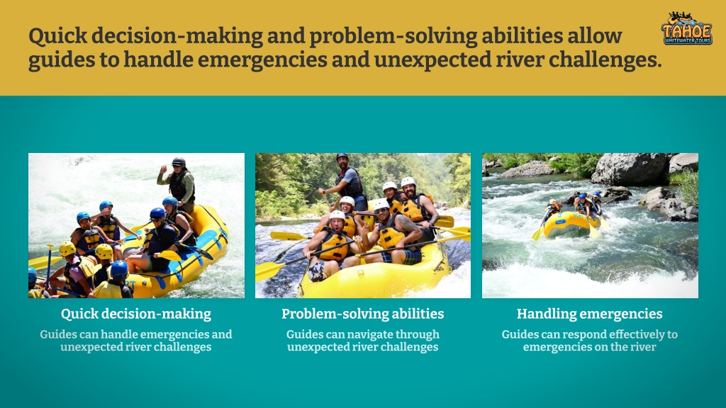 Quick decision-making and problem-solving abilities allow guides to handle emergencies and unexpected river challenges. Quick decision-making Guides can handle emergencies and unexpected river challenges Problem-solving abilities Guides can navigate through unexpected river challenges Handling emergencies Guides can respond effectively to emergencies on the river