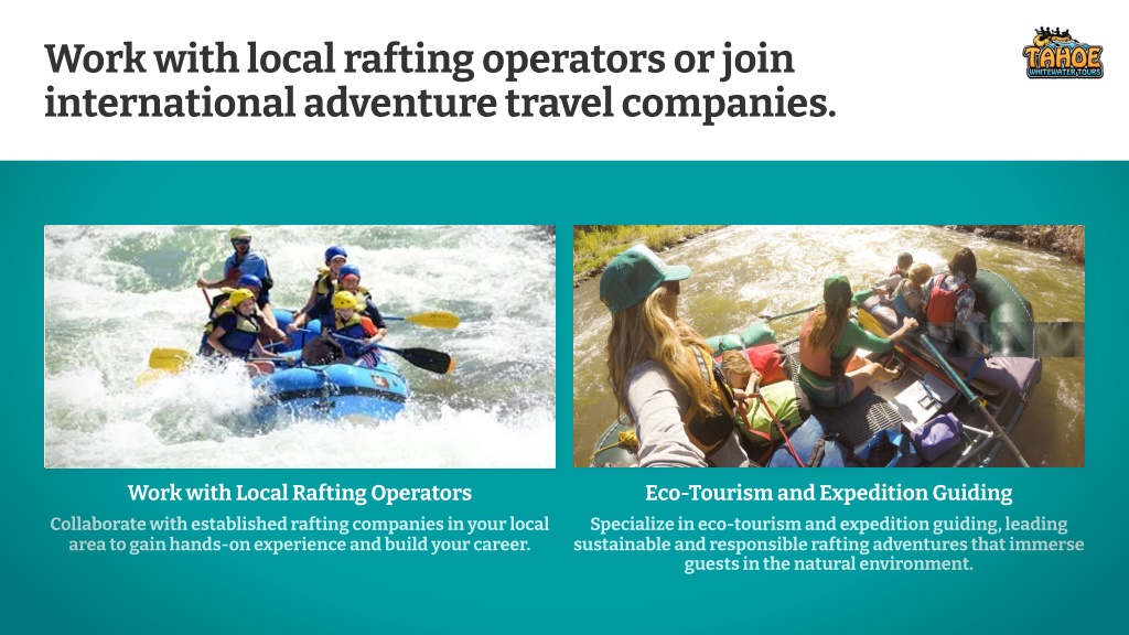Work with local rafting operators or join international adventure travel companies. Work with Local Rafting Operators Collaborate with established rafting companies in your local area to gain hands-on experience and build your career. Eco-Tourism and Expedition Guiding Specialize in eco-tourism and expedition guiding, leading sustainable and responsible rafting adventures that immerse guests in the natural environment.