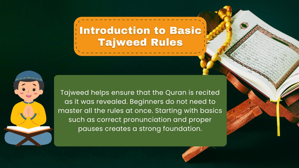 Introduction to Basic Tajweed Rules Tajweed helps ensure that the Quran is recited as it was revealed. Beginners do not need to master all the rules at once. Starting with basics such as correct pronunciation and proper pauses creates a strong foundation.