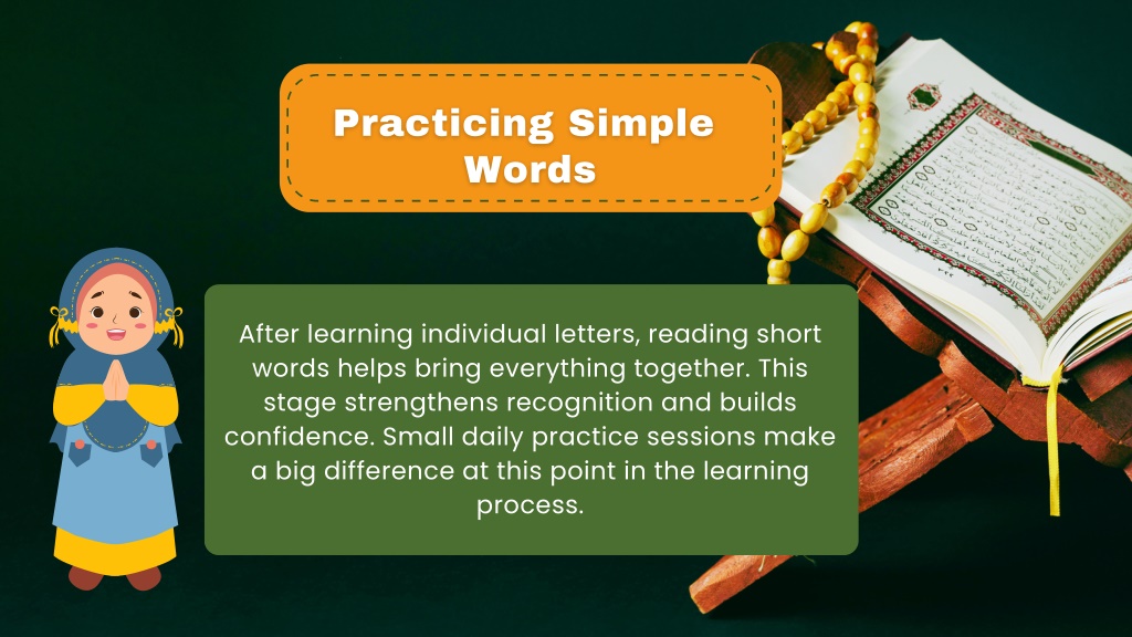 Practicing Simple Words After learning individual letters, reading short words helps bring everything together. This stage strengthens recognition and builds confidence. Small daily practice sessions make a big difference at this point in the learning process.