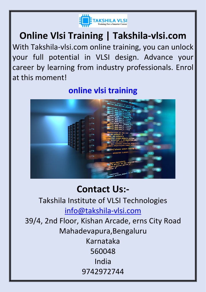 Online Vlsi Training | Takshila-vlsi.com With Takshila-vlsi.com online training, you can unlock your full potential in VLSI design. Advance your career by learning from industry professionals. Enrol at this moment! online vlsi training Contact Us:- Takshila Institute of VLSI Technologies info@takshila-vlsi.com 39/4, 2nd Floor, Kishan Arcade, erns City Road Mahadevapura,Bengaluru Karnataka 560048 India 9742972744