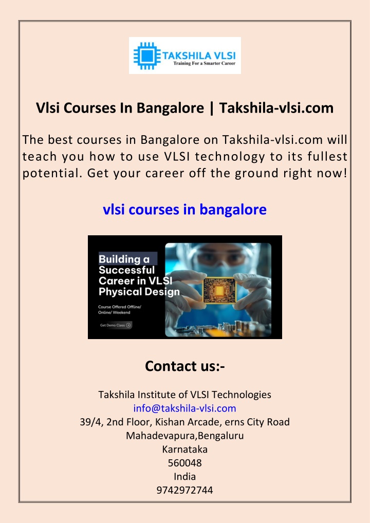 1. Vlsi Courses In Bangalore | Takshila-vlsi.com The best courses in Bangalore on Takshila-vlsi.com will teach you how to use VLSI technology to its fullest potential. Get your career off the ground right now! vlsi courses in bangalore Contact us:- Takshila Institute of VLSI Technologies info@takshila-vlsi.com 39/4, 2nd Floor, Kishan Arcade, erns City Road Mahadevapura,Bengaluru Karnataka 560048 India 9742972744