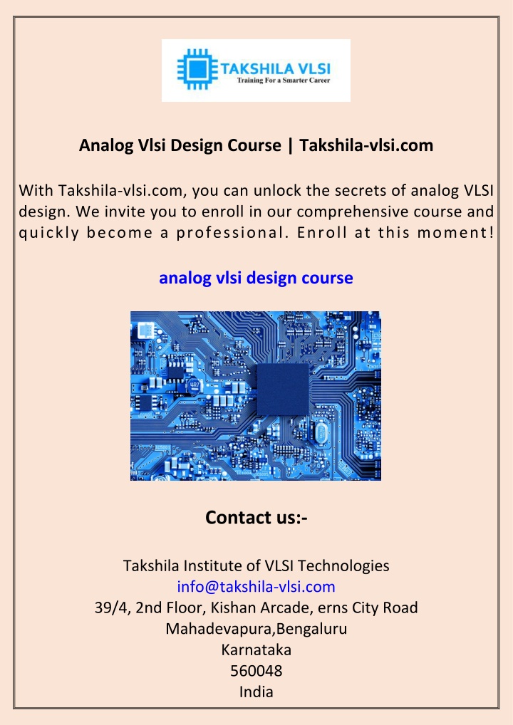 1. Analog Vlsi Design Course | Takshila-vlsi.com With Takshila-vlsi.com, you can unlock the secrets of analog VLSI design. We invite you to enroll in our comprehensive course and quickly become a professional. Enroll at this moment! analog vlsi design course Contact us:- Takshila Institute of VLSI Technologies info@takshila-vlsi.com 39/4, 2nd Floor, Kishan Arcade, erns City Road Mahadevapura,Bengaluru Karnataka 560048 India
