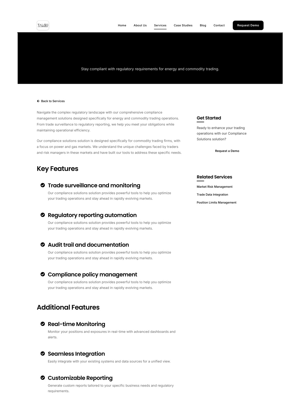 RequestDemo Home AboutUs Services CaseStudies Blog Contact Compliance Solutions Staycompliantwithregulatoryrequirementsforenergyandcommoditytrading. BacktoServices Navigatethecomplexregulatorylandscapewithourcomprehensivecompliance Get Started managementsolutionsdesignedspecificallyforenergyandcommoditytradingoperations. Fromtradesurveillancetoregulatoryreporting, wehelpyoumeetyourobligationswhile Readytoenhanceyourtrading maintainingoperationalefficiency. operationswithourCompliance Solutionssolution? Ourcompliancesolutionssolutionisdesignedspecificallyforcommoditytradingfirms, with afocusonpowerandgasmarkets. Weunderstandtheuniquechallengesfacedbytraders RequestaDemo andriskmanagersinthesemarketsandhavebuiltourtoolstoaddressthesespecificneeds. Key Features Related Services Trade surveillance and monitoring MarketRiskManagement Ourcompliancesolutionssolutionprovidespowerfultoolstohelpyouoptimize TradeDataIntegration yourtradingoperationsandstayaheadinrapidlyevolvingmarkets. PositionLimitsManagement Regulatory reporting automation Ourcompliancesolutionssolutionprovidespowerfultoolstohelpyouoptimize yourtradingoperationsandstayaheadinrapidlyevolvingmarkets. Audit trail and documentation Ourcompliancesolutionssolutionprovidespowerfultoolstohelpyouoptimize yourtradingoperationsandstayaheadinrapidlyevolvingmarkets. Compliance policy management Ourcompliancesolutionssolutionprovidespowerfultoolstohelpyouoptimize yourtradingoperationsandstayaheadinrapidlyevolvingmarkets. Additional Features Real-time Monitoring Monitoryourpositionsandexposuresinreal-timewithadvanceddashboardsand alerts. Seamless Integration Easilyintegratewithyourexistingsystemsanddatasourcesforaunifiedview. Customizable Reporting Generatecustomreportstailoredtoyourspecificbusinessneedsandregulatory requirements.