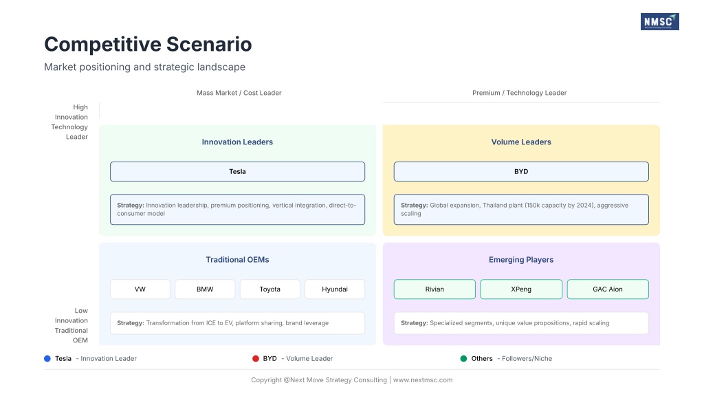 CompetitiveScenario Marketpositioningandstrategiclandscape MassMarket / CostLeader Premium / TechnologyLeader High Innovation Technology Leader InnovationLeaders VolumeLeaders Tesla BYD Strategy:Innovationleadership, premiumpositioning, verticalintegration, direct-to- consumermodel Strategy:Globalexpansion, Thailandplant (150kcapacityby 2024), aggressive scaling TraditionalOEMs EmergingPlayers VW BMW Toyota Hyundai Rivian XPeng GACAion Low Innovation Traditional Strategy:TransformationfromICEtoEV, platformsharing, brandleverage Strategy:Specializedsegments, uniquevaluepropositions, rapidscaling OEM Tesla - InnovationLeader BYD - VolumeLeader Others - Followers/Niche Copyright @NextMoveStrategyConsulting | www.nextmsc.com