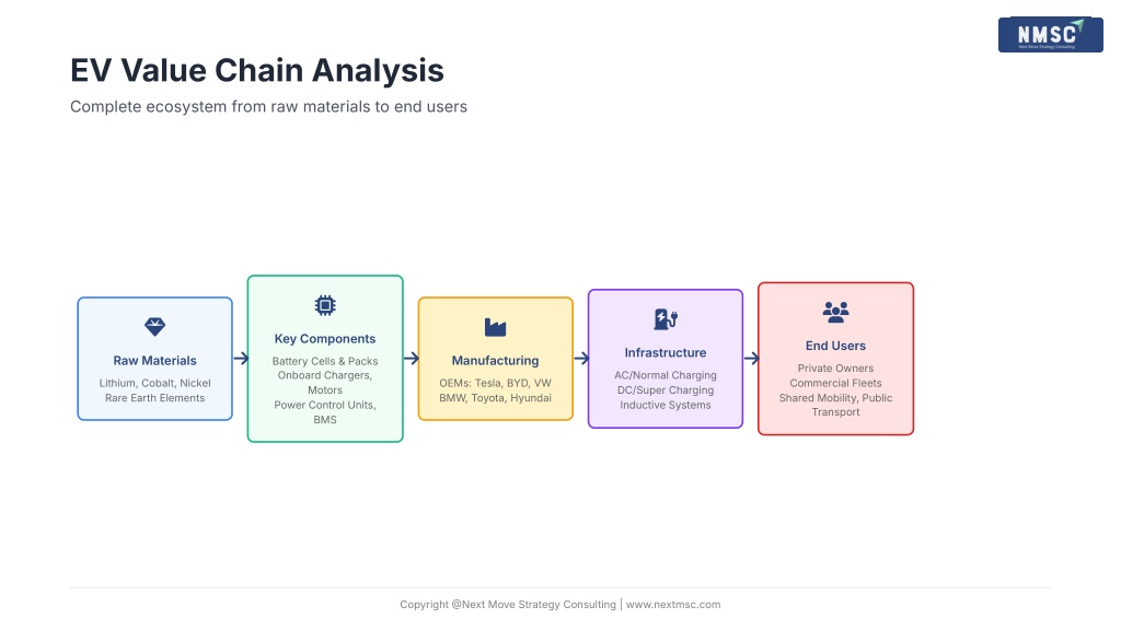 EVValueChainAnalysis Completeecosystemfromrawmaterialstoendusers KeyComponents EndUsers Infrastructure → → → → RawMaterials Manufacturing BatteryCells & Packs OnboardChargers, Motors PowerControlUnits, BMS PrivateOwners CommercialFleets SharedMobility, Public Transport AC/NormalCharging DC/SuperCharging InductiveSystems Lithium, Cobalt, Nickel RareEarthElements OEMs: Tesla, BYD, VW BMW, Toyota, Hyundai Copyright @NextMoveStrategyConsulting | www.nextmsc.com