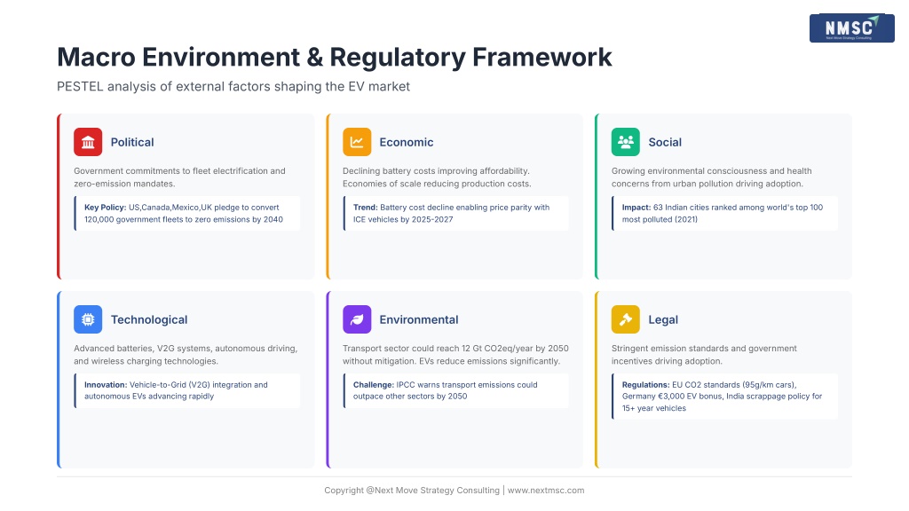 MacroEnvironment & RegulatoryFramework PESTELanalysisofexternalfactorsshapingtheEVmarket Political Economic Social Governmentcommitmentstofleetelectrificationand zero-emissionmandates. Decliningbatterycostsimprovingaffordability. Economiesofscalereducingproductioncosts. Growingenvironmentalconsciousnessandhealth concernsfromurbanpollutiondrivingadoption. KeyPolicy:US,Canada,Mexico,UKpledgetoconvert 120,000 governmentfleetstozeroemissionsby 2040 Trend:Batterycostdeclineenablingpriceparitywith ICEvehiclesby 2025-2027 Impact: 63 Indiancitiesrankedamongworld'stop 100 mostpolluted (2021) Technological Environmental Legal Advancedbatteries, V2Gsystems, autonomousdriving, andwirelesschargingtechnologies. Transportsectorcouldreach 12 GtCO2eq/yearby 2050 withoutmitigation. EVsreduceemissionssignificantly. Stringentemissionstandardsandgovernment incentivesdrivingadoption. Innovation:Vehicle-to-Grid (V2G) integrationand autonomousEVsadvancingrapidly Challenge:IPCCwarnstransportemissionscould outpaceothersectorsby 2050 Regulations:EUCO2 standards (95g/kmcars), Germany €3,000 EVbonus, Indiascrappagepolicyfor 15+ yearvehicles Copyright @NextMoveStrategyConsulting | www.nextmsc.com