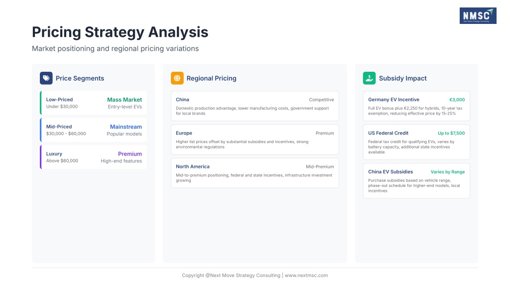 PricingStrategyAnalysis Marketpositioningandregionalpricingvariations PriceSegments RegionalPricing SubsidyImpact MassMarket Entry-levelEVs Low-Priced Under$30,000 China GermanyEVIncentive Competitive €3,000 Domesticproductionadvantage, lowermanufacturingcosts, governmentsupport forlocalbrands FullEVbonusplus €2,250 forhybrids, 10-yeartax exemption, reducingeffectivepriceby 15-25% Mainstream Popularmodels Mid-Priced $30,000 - $60,000 Europe USFederalCredit Premium Upto$7,500 Higherlistpricesoffsetbysubstantialsubsidiesandincentives, strong environmentalregulations FederaltaxcreditforqualifyingEVs, variesby batterycapacity, additionalstateincentives available Premium Luxury Above$60,000 High-endfeatures NorthAmerica Mid-Premium ChinaEVSubsidies VariesbyRange Mid-to-premiumpositioning, federalandstateincentives, infrastructureinvestment growing Purchasesubsidiesbasedonvehiclerange, phase-outscheduleforhigher-endmodels, local incentives Copyright @NextMoveStrategyConsulting | www.nextmsc.com