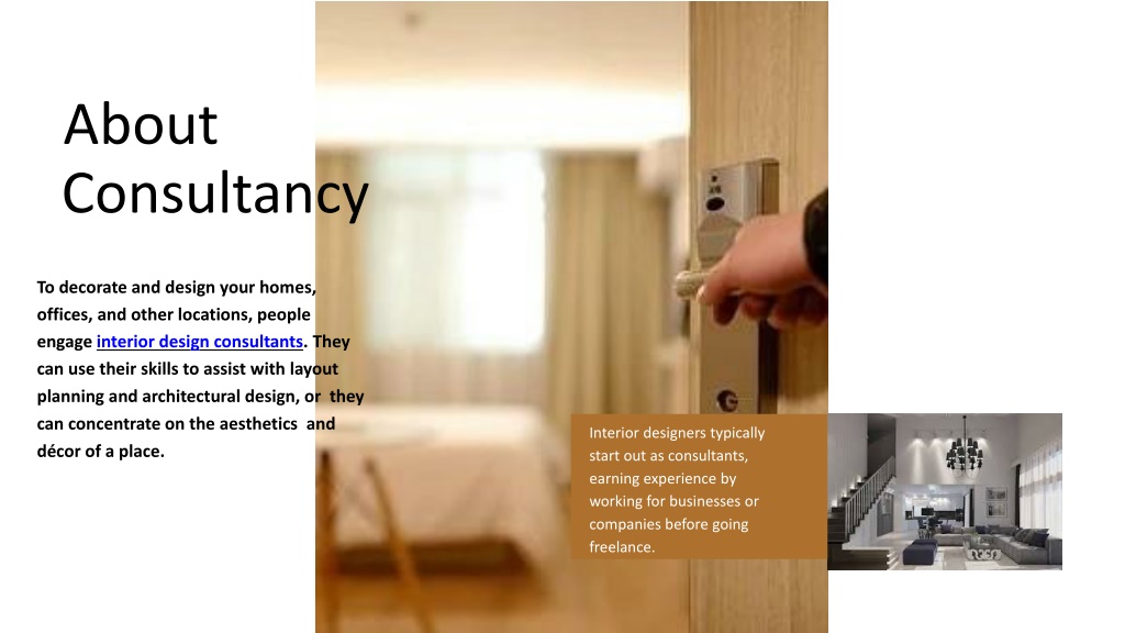 About Consultancy To decorate and design your homes, offices, and other locations, people engage interior design consultants. They can use their skills to assist with layout planning and architectural design, or they can concentrate on the aesthetics and décor of a place. Interior designers typically start out as consultants, earning experience by working for businesses or companies before going freelance.