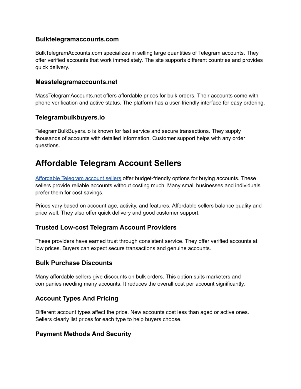 Bulktelegramaccounts.com BulkTelegramAccounts.com specializes in selling large quantities of Telegram accounts. They offer verified accounts that work immediately. The site supports different countries and provides quick delivery. Masstelegramaccounts.net MassTelegramAccounts.net offers affordable prices for bulk orders. Their accounts come with phone verification and active status. The platform has a user-friendly interface for easy ordering. Telegrambulkbuyers.io TelegramBulkBuyers.io is known for fast service and secure transactions. They supply thousands of accounts with detailed information. Customer support helps with any order questions. Affordable Telegram Account Sellers Affordable Telegram account sellers offer budget-friendly options for buying accounts. These sellers provide reliable accounts without costing much. Many small businesses and individuals prefer them for cost savings. Prices vary based on account age, activity, and features. Affordable sellers balance quality and price well. They also offer quick delivery and good customer support. Trusted Low-cost Telegram Account Providers These providers have earned trust through consistent service. They offer verified accounts at low prices. Buyers can expect secure transactions and genuine accounts. Bulk Purchase Discounts Many affordable sellers give discounts on bulk orders. This option suits marketers and companies needing many accounts. It reduces the overall cost per account significantly. Account Types And Pricing Different account types affect the price. New accounts cost less than aged or active ones. Sellers clearly list prices for each type to help buyers choose. Payment Methods And Security