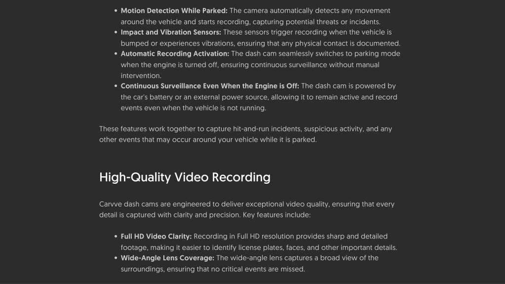 • Motion Detection While Parked: The camera automatically detects any movement around the vehicle and starts recording, capturing potential threats or incidents. • Impact and Vibration Sensors: These sensors trigger recording when the vehicle is bumped or experiences vibrations, ensuring that any physical contact is documented. • Automatic Recording Activation: The dash cam seamlessly switches to parking mode when the engine is turned off, ensuring continuous surveillance without manual intervention. • Continuous Surveillance Even When the Engine is Off: The dash cam is powered by the car's battery or an external power source, allowing it to remain active and record events even when the vehicle is not running. These features work together to capture hit-and-run incidents, suspicious activity, and any other events that may occur around your vehicle while it is parked. High-Quality Video Recording Carvve dash cams are engineered to deliver exceptional video quality, ensuring that every detail is captured with clarity and precision. Key features include: • Full HD Video Clarity: Recording in Full HD resolution provides sharp and detailed footage, making it easier to identify license plates, faces, and other important details. • Wide-Angle Lens Coverage: The wide-angle lens captures a broad view of the surroundings, ensuring that no critical events are missed.