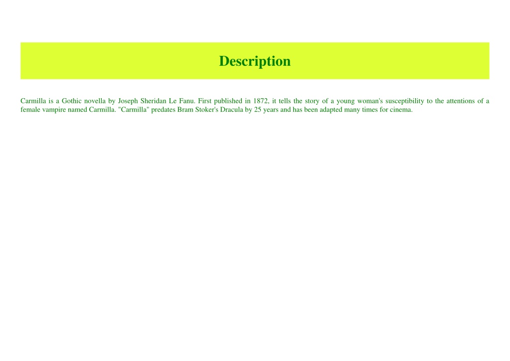 Description Carmilla is a Gothic novella by Joseph Sheridan Le Fanu. First published in 1872, it tells the story of a young woman's susceptibility to the attentions of a female vampire named Carmilla. "Carmilla" predates Bram Stoker's Dracula by 25 years and has been adapted many times for cinema.