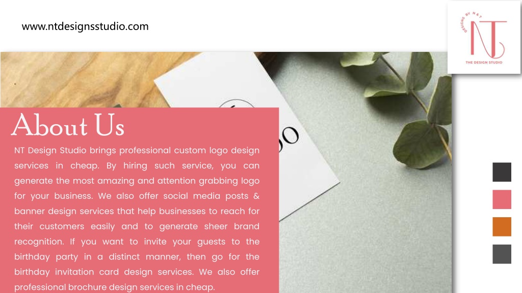 www.ntdesignsstudio.com About Us NT Design Studio brings professional custom logo design services in cheap. By hiring such service, you can generate the most amazing and attention grabbing logo for your business. We also offer social media posts & banner design services that help businesses to reach for their customers easily and to generate sheer brand recognition. If you want to invite your guests to the birthday party in a distinct manner, then go for the birthday invitation card design services. We also offer professional brochure design services in cheap.