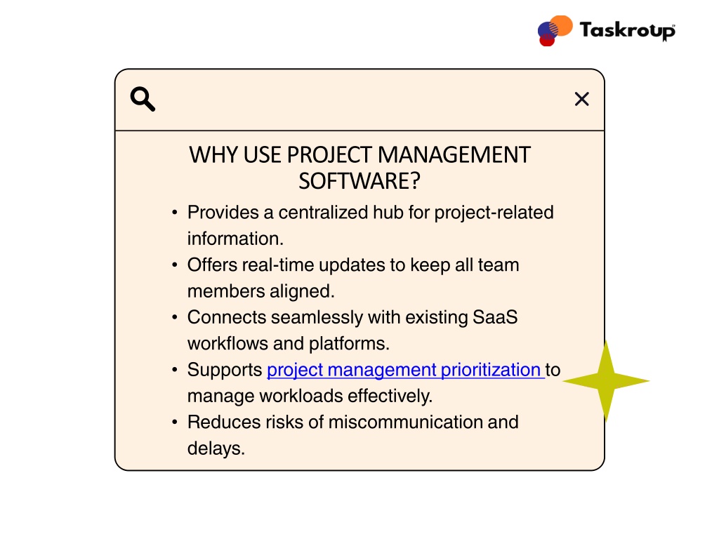WHY USE PROJECT MANAGEMENT SOFTWARE? • Provides a centralized hub for project-related information. • Offers real-time updates to keep all team members aligned. • Connects seamlessly with existing SaaS workflows and platforms. • Supports project management prioritization to manage workloads effectively. • Reduces risks of miscommunication and delays.