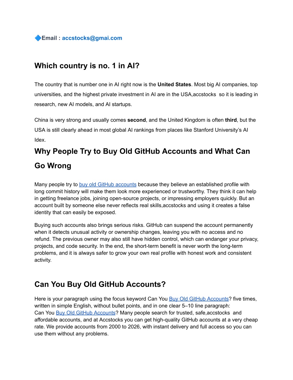 ?Email : accstocks@gmai.com Which country is no. 1 in AI? The country that is number one in AI right now is the United States. Most big AI companies, top universities, and the highest private investment in AI are in the USA,accstocks so it is leading in research, new AI models, and AI startups. China is very strong and usually comes second, and the United Kingdom is often third, but the USA is still clearly ahead in most global AI rankings from places like Stanford University’s AI Idex. Why People Try to Buy Old GitHub Accounts and What Can Go Wrong Many people try to buy old GitHub accounts because they believe an established profile with long commit history will make them look more experienced or trustworthy. They think it can help in getting freelance jobs, joining open-source projects, or impressing employers quickly. But an account built by someone else never reflects real skills,accstocks and using it creates a false identity that can easily be exposed. Buying such accounts also brings serious risks. GitHub can suspend the account permanently when it detects unusual activity or ownership changes, leaving you with no access and no refund. The previous owner may also still have hidden control, which can endanger your privacy, projects, and code security. In the end, the short-term benefit is never worth the long-term problems, and it is always safer to grow your own real profile with honest work and consistent activity. Can You Buy Old GitHub Accounts? Here is your paragraph using the focus keyword Can You Buy Old GitHub Accounts? five times, written in simple English, without bullet points, and in one clear 5–10 line paragraph: Can You Buy Old GitHub Accounts? Many people search for trusted, safe,accstocks and affordable accounts, and at Accstocks you can get high-quality GitHub accounts at a very cheap rate. We provide accounts from 2000 to 2026, with instant delivery and full access so you can use them without any problems.