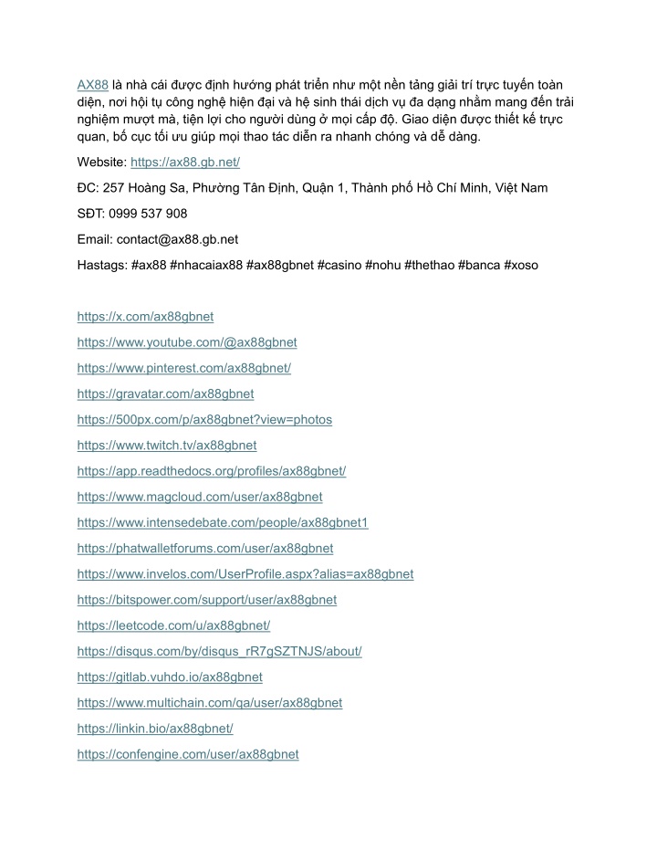 AX88là nhà cái được định hướng phát triển như một nền tảng giải trí trực tuyến toàn diện, nơi hội tụ công nghệ hiện đại và hệ sinh thái dịch vụ đa dạng nhằm mang đến trải nghiệm mượt mà, tiện lợi cho người dùng ở mọi cấp độ. Giao diện được thiết kế trực quan, bố cục tối ưu giúp mọi thao tác diễn ra nhanh chóng và dễ dàng. Website:https://ax88.gb.net/ ĐC: 257 Hoàng Sa, Phường Tân Định, Quận 1, Thành phố Hồ Chí Minh, Việt Nam SĐT: 0999 537 908 Email: contact@ax88.gb.net Hastags: #ax88 #nhacaiax88 #ax88gbnet #casino #nohu #thethao #banca #xoso https://x.com/ax88gbnet https://www.youtube.com/@ax88gbnet https://www.pinterest.com/ax88gbnet/ https://gravatar.com/ax88gbnet https://500px.com/p/ax88gbnet?view=photos https://www.twitch.tv/ax88gbnet https://app.readthedocs.org/profiles/ax88gbnet/ https://www.magcloud.com/user/ax88gbnet https://www.intensedebate.com/people/ax88gbnet1 https://phatwalletforums.com/user/ax88gbnet https://www.invelos.com/UserProfile.aspx?alias=ax88gbnet https://bitspower.com/support/user/ax88gbnet https://leetcode.com/u/ax88gbnet/ https://disqus.com/by/disqus_rR7gSZTNJS/about/ https://gitlab.vuhdo.io/ax88gbnet https://www.multichain.com/qa/user/ax88gbnet https://linkin.bio/ax88gbnet/ https://confengine.com/user/ax88gbnet