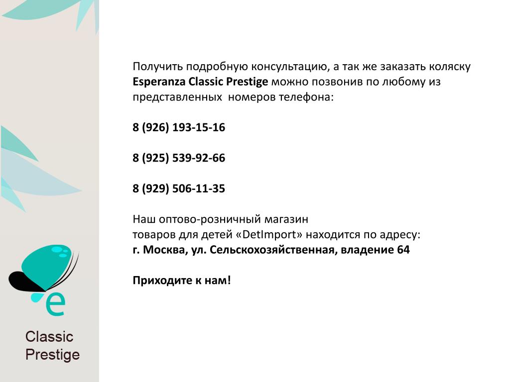 Получить подробную консультацию, а так же заказать коляску Esperanza Classic Prestige можно позвонив по любому из представленных номеров телефона: 8 (926) 193-15-16 8 (925) 539-92-66 8 (929) 506-11-35 Наш оптово-розничный магазинтоваров для детей «DetImport» находится по адресу: г. Москва, ул. Сельскохозяйственная, владение 64 Приходите к нам!